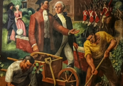 Beneath this historical tableau are men engaged in agricultural labor—digging and tending to the earth. This scene is a nod to America’s agrarian roots, a reminder that the nation’s earliest foundations were laid by hard work and perseverance. The imagery suggests that while leadership guided the country’s course, it was the toil of the common people that truly shaped the land and secured its future.  There are dark subtle references to the brutal legacy of slavery; as what appear to be slaves, lurch out from a hidden passageway.